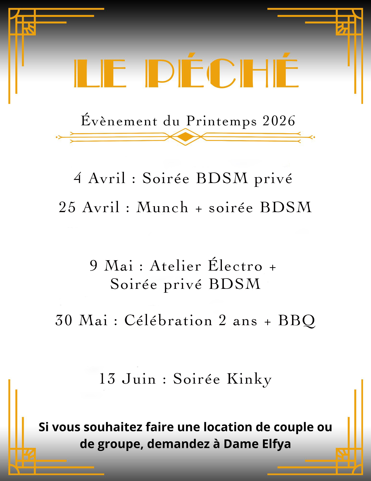 Il aura une soirée BDSM en soirée ou vous pourrez pratiquer vos nouvelles tecniques.